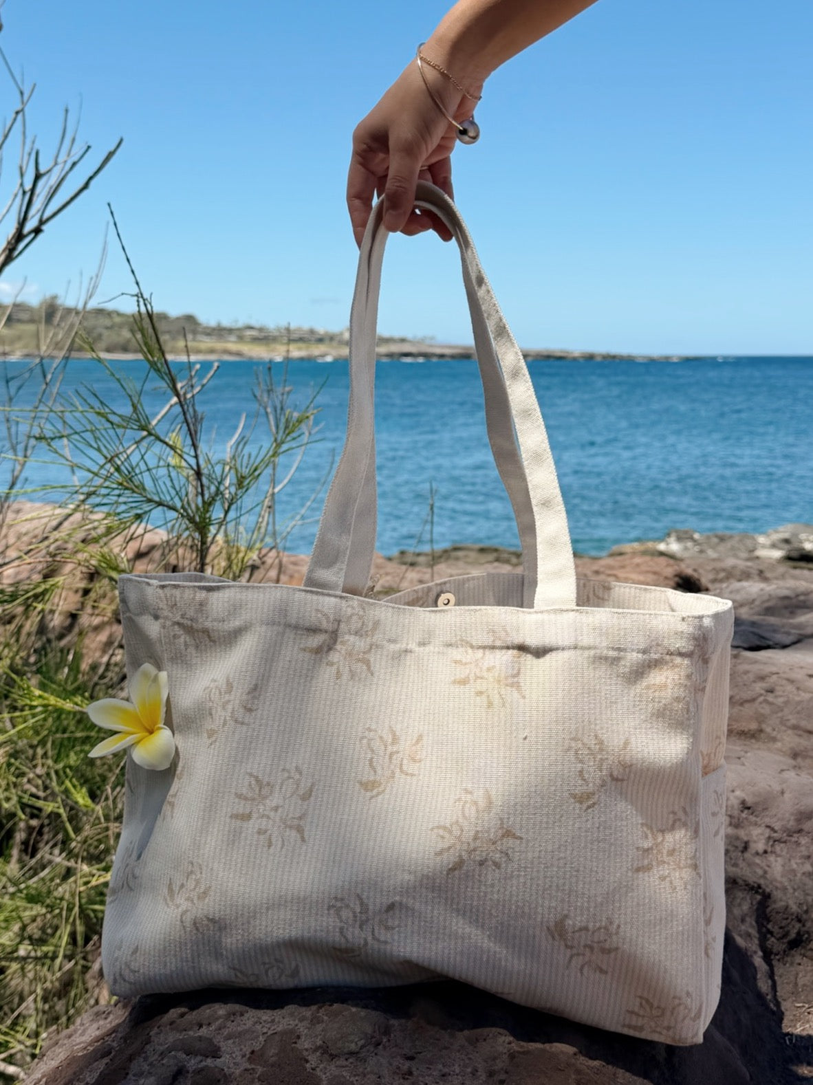 Inspired by ‘ūlei and the way they grow in beautiful bunches! Our newest boxy tote was designed to have 2 side pockets (for easy storage of your smaller items so they don’t get lost in the big portion of the tote), magnetic clasp to close, fun boxy shape and sized to fit all of your essentials. We love it and know you will too!!